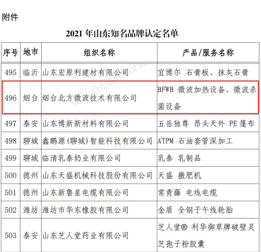 12月20日,山東省建設(shè)促進會發(fā)布《2021年度山東認定公告》,根據(jù)《山東認定管理辦法》的規(guī)定,經(jīng)組織申報、資格審查、大數(shù)據(jù)挖掘、系統(tǒng)平臺評審、專家評審等環(huán)節(jié),煙臺北方微波技術(shù)有限公司BFWB 微波加熱設(shè)備、微波殺菌設(shè)備榮獲2021年度山東。